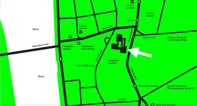 CAMP shares the same address as IPR Prague, in the centre of the city, near Charles Square, within sight of the Emmaus Monastery. These modernistic buildings from the end of the 1960s were designed by the renowned 20th century Czech architect, Karel Prager. Prager is also the author of the Nová scéna building of the National Theatre, and the former Federal Assembly building – currently part of the National Museum.
