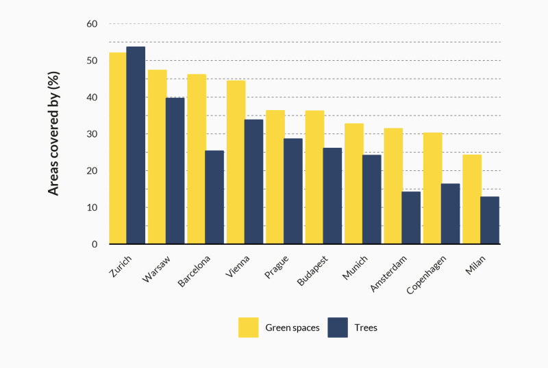 Chart: Share of green areas and areas covered by tree canopy in total city area