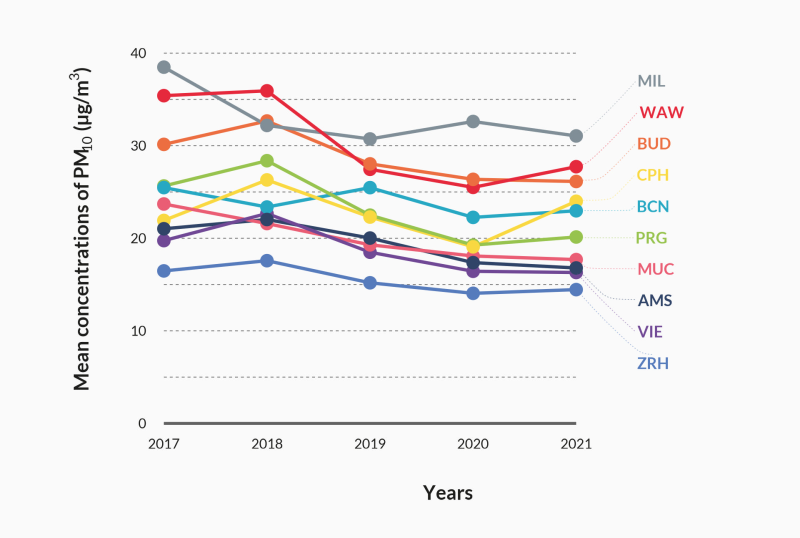 Monitoring PM10 concentrations is one way of measuring air quality. Their average concentration has been declining across the selected cities, except in Copenhagen, since 2017. At the same time, the differences between the cities are steadily decreasing. Prague maintains an average position.