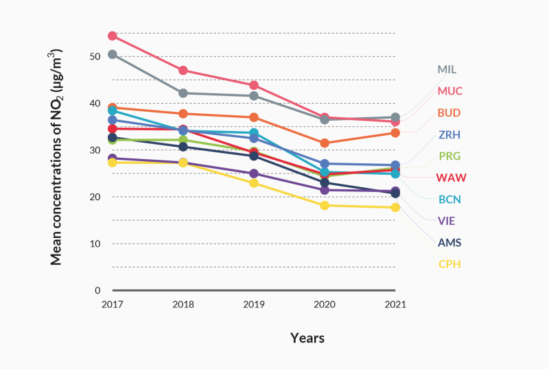 Another way of measuring air quality is to monitor nitrogen dioxide (NO₂) concentration. Its average concentration has fallen across all the selected cities since 2017. Prague performs similarly in NO2 concentration as it does in dust particle concentration, thus achieving average air quality compared to the other selected cities.