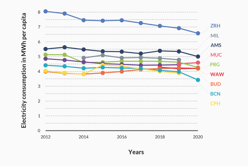 Annual electricity consumption per 1,000 inhabitants was very similar in the compared cities between 2012 and 2021. The higher consumption levels in Zurich appear to be exceptional and may instead be related to the relatively lower use of district heating supplies. There is a clear trend towards a slight reduction in electricity consumption in most cities, including Prague.
