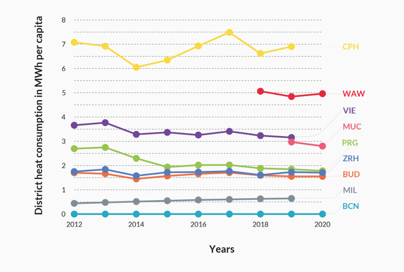 *Source: Pražská teplárenská, a.s. - annual reports, wien.gv.at, swm.de - Stadtwerke München, MDPI - Energies 2021, ksh.hu, sparenergi.dk, Ajuntament de Barcelona, Medi Ambient i Serveis Urbans - Ecologia Urbana, Agència d'Energia de Barcelona, stadt-zuerich.ch, istat.it