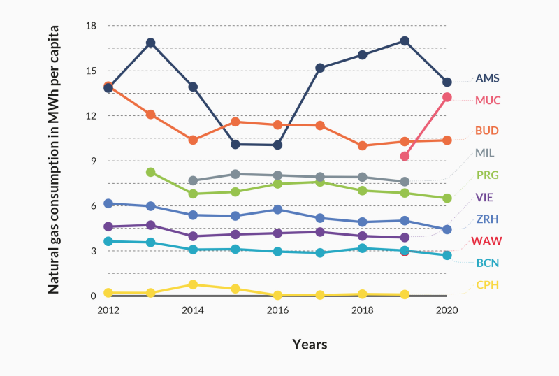 *Source: Czech Statistical Office - Statistical Yearbooks of the City of Prague - from data of the Energy Regulatory Office, wien.gv.at, swm.de - Stadtwerke München, MDPI - Energies 2021, ksh.hu, sparenergi.dk, Ajuntament de Barcelona, Medi Ambient i Serveis Urbans - Ecologia Urbana, Agència d'Energia de Barcelona, stadt-zuerich.ch, opendata.cbs.nl/statline/#/CBS/ - CBS, istat.it
