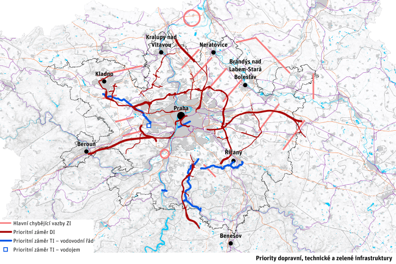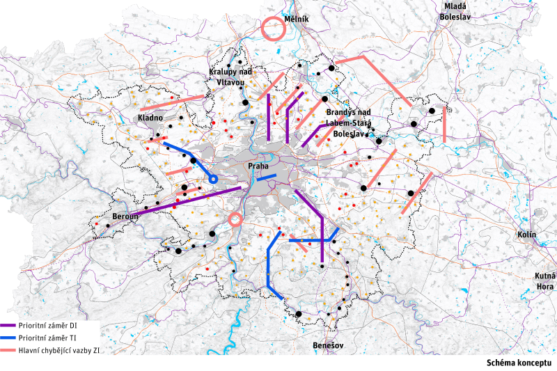 Základní principy koncepce dopravní infrastruktury vychází z celostátních a krajských strategických dokumentů. Z logiky systému nadřazené dokumentace lze všechny prvky ze ZÚR a PÚR považovat za prioritní. Ve studii jsou vybrány prvky, jejichž realizace je nezbytná pro celkovou funkčnost dopravní infrastruktury. Jedná se mimo jiné o dostavbu Pražského okruhu, Městského okruhu a dalších komunikací. Důležitá bude realizace vysokorychlostních tratí směrem do Brna nebo do Drážďan, a také novostavby tratě do Berouna a Neratovické spojky.