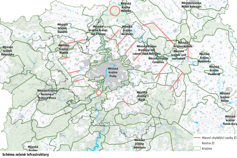Chybějící vazby vychází z analýz a deficitů v území a mají podpořit konektivitu v území a doplnit místa s nedostatkem prvků zelené infrastruktury. Vazby ZI se zaměřují na spojení různých částí krajiny, které jsou odděleny hlavně v důsledku lidské činnosti, například zástavbou, dopravou nebo nečleněnými plochami zemědělské půdy (například v Polabí). +Studie potvrzuje význam připravovaného krajinného parku na soutoku Vltavy a Berounky, a navrhuje založení krajinného parku na soutoku Vltavy a Labe.