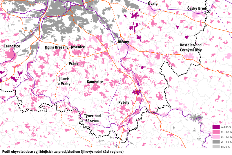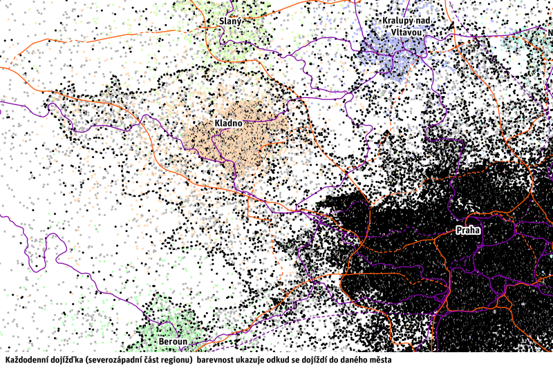 Studie také analyzovala dojížďku pomocí dat mobilních operátorů, z nichž vyplynula dnešní dynamika dojíždění za prací či za studiem. Potvrdilo se, že větší města jsou významným cílem i pro vlastní obyvatele, kteří tak nemusí cestovat pryč. Naopak z vesnic většina obyvatel každé ráno odjede pryč (například z Řitky nebo z Květnice je to přes 80 % obyvatel!). Prahy je a bude nejvýznamnějším centrem. Každý den do ní přijíždí 240 tisíc lidí a naopak 80 tisíc obyvatel vyjíždí ven.