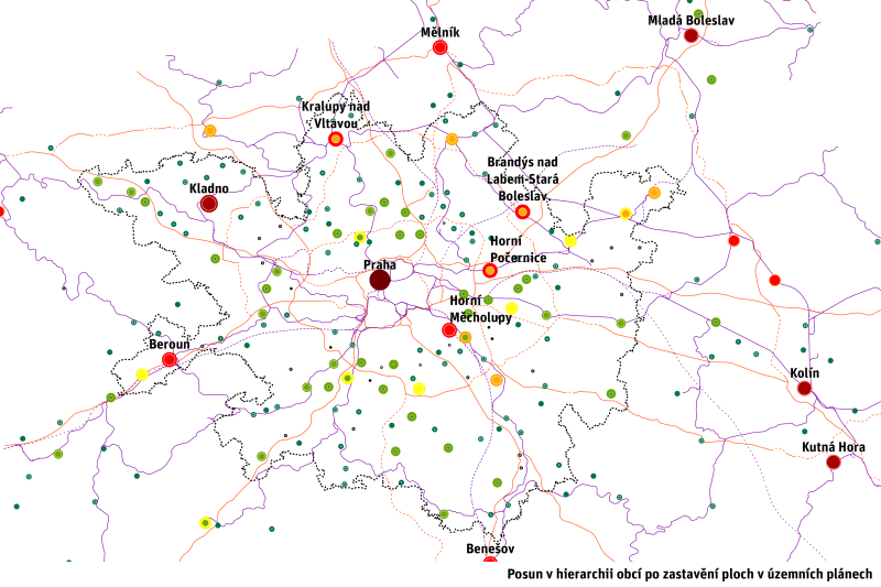 Studie sestavila strukturu obcí v regionu v návaznosti na jejich hierarchii, která je postavena na vybavenosti, počtu obyvatel i spádovosti. Hierarchie je pro zajímavost zpracována i tak, že určité části Prahy (dle krajin) jsou hodnoceny jako samostatná sídla (například Horní Počernice či Horní Měcholupy jsou na úrovni Kralup nebo Berouna). Studie také ukazuje, které obce v budoucnu poskočí do vyšší kategorie po realizaci plánového rozvoje (například Kralupy nad Vltavou nebo Brandýs nad Labem-Stará Boleslav). Pokud by byla Uhříněves samostatnou obcí, posunula by se časem dokonce o dvě úrovně výš.