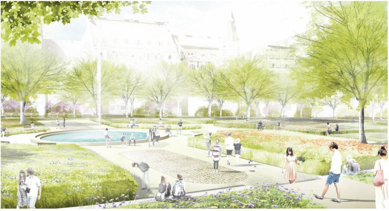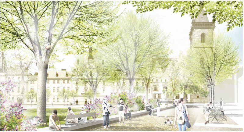- Severní část parku u Novoměstské radnice nově poskytne zpevněné plochy, které umožní konání společenských a kulturních událostí či místních trhů.