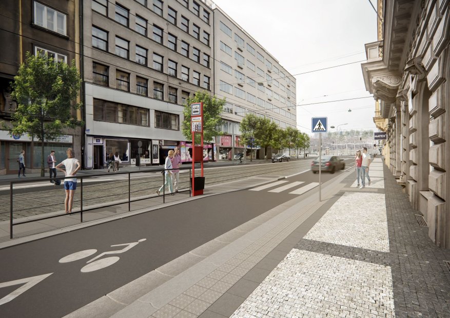 - The study proposes moving the “Dlouhá třída” tram stop towards the Vltava river opposite the existing stop in the opposite direction. The two stops being opposite each other will create two new crossings and at the same time improve the accessibility of the waterfront and the river.