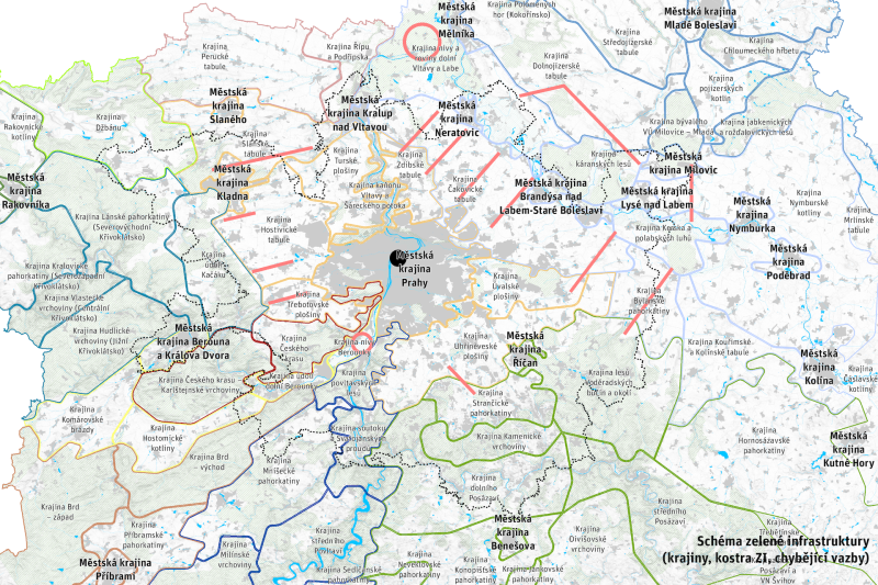 Územní studie navrhuje kostru zelené infrastruktury, identifikuje chybějící vazby a vymezuje krajiny a krajinné oblasti. Krajiny jsou individuálními jednotkami se shodným charakterem. Krajiny byly vymezeny za účelem jednotného přístupu k řešenému území a zároveň jeho diferenciace do charakteristických, vzájemně odlišných částí. Krajiny byly vymezeny stejným způsobem, jaký byl použit v pražských Zásadách územního rozvoje a je možné je použít ve středočeských ZÚR, aby byla zajištěna vzájemná návaznost. Na území obou krajů bylo vymezeno 97 krajin, které jsou rozděleny na 22 městských a 75 venkovských krajin. Městskou krajinou se rozumí prostor od středu města po jeho okraj, který má charakter městského prostředí, včetně enkláv otevřené krajiny, které jsou tímto prostorem obklopeny. Venkovskou krajinou je prostor otevřené krajiny s výjimkou enkláv otevřené krajiny a obce, pro které není vymezena jejich vlastní městská krajina. Krajiny jsou vymezeny v měřítku a podrobnosti kraje/ZÚR a jsou dále zpřesněny v jiných dokumentacích, například Metropolitní plán tak činí prostřednictvím lokalit. Na základě podobných rysů lze krajiny seskupit do širších celků – krajinných oblastí.