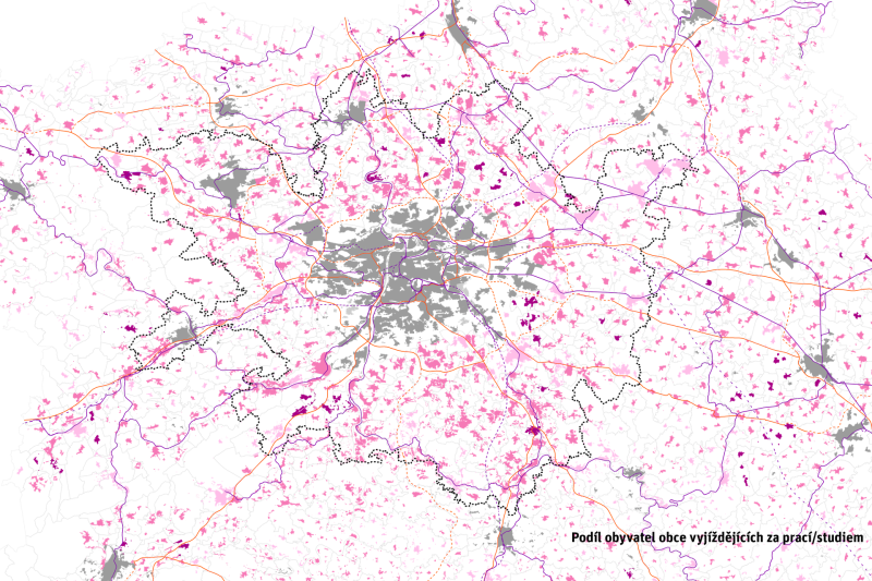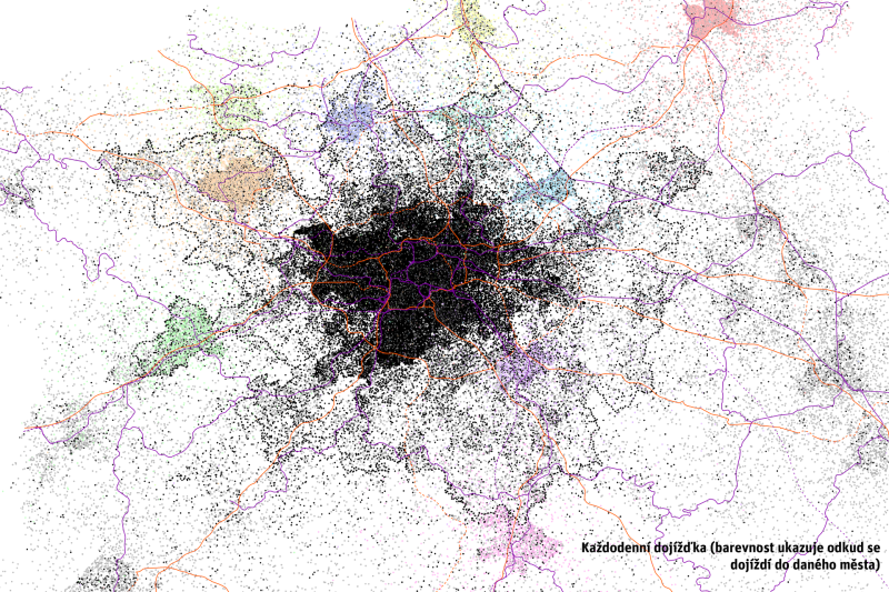 Studie také analyzovala dojížďku pomocí dat mobilních operátorů, z nichž vyplynula dnešní dynamika dojíždění za prací či za studiem. Potvrdilo se, že větší města jsou významným cílem i pro vlastní obyvatele, kteří tak nemusí cestovat pryč. Naopak z vesnic většina obyvatel každé ráno odjede pryč (například z Řitky nebo z Květnice je to přes 80 % obyvatel!). Prahy je a bude nejvýznamnějším centrem. Každý den do ní přijíždí 240 tisíc lidí a naopak 80 tisíc obyvatel vyjíždí ven.