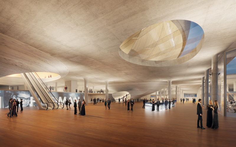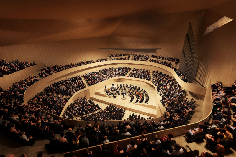 Umístění velkých prosklených ploch u foyer sálů a přístupné střešní terasy s atraktivním výhledem na město vhodně propojují interiér a exteriér stavby. Řešení nábřežní hrany v tomto případě odpovídá měřítku celku. Dobře je vyřešená doprava parkoviště a zásobovacího dvora. Celkově jde o prostorově efektivní stavbu odpovídající předpokládanému objemu a podlahovým plochám stavebního programu.