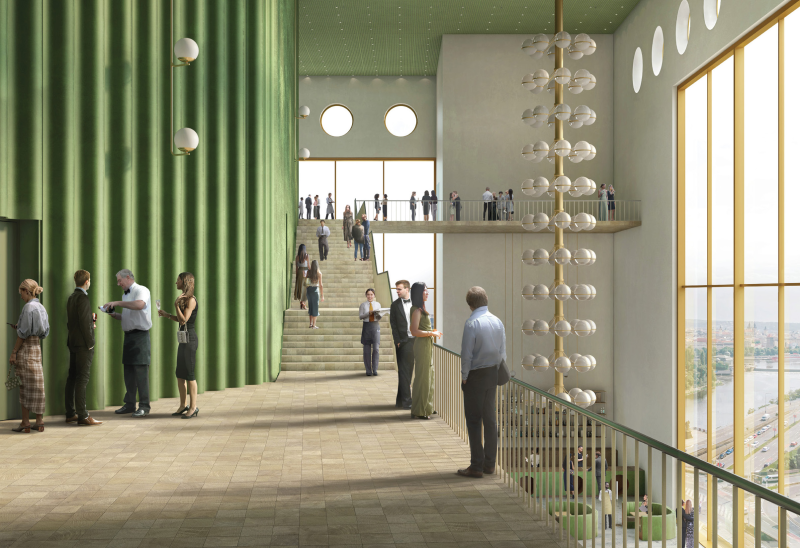 Nová filharmonie pro město Keplera je dokonalou krychlí. Jedná se o celistvý hudební box (hrací skříňku). Elegantní nástroj vyvinutý výhradně pro hudební mizanscénu, profesionální a precizní: jeho velká městská okna vystavují různá foyer vstříc městu a vizuálně jej zapojují do hudebního života, který se uvnitř odehrává. Díky své prominentní poloze přímo na břehu Vltavy a podél magistrály vytváří tento Velký dům hudby park a náměstí. Náměstí představuje jak budovu, tak město a chce je proměnit v metropolitní celek. Park v zadní části je ekologickým majákem pro novou budoucí čtvrť, která je ve vývoji.