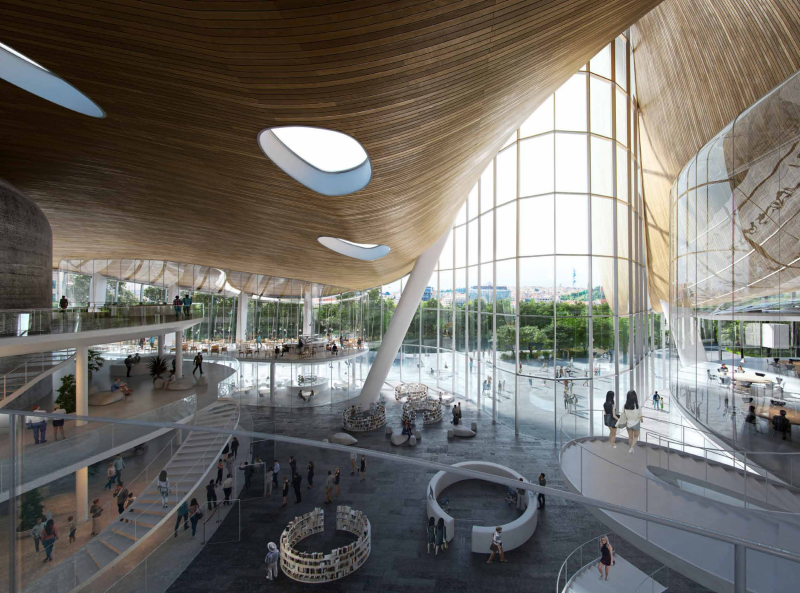 Stověžatá Praha stojí na Vltavě, jejímiž vodami se nesou příběhy této země. Hudba zde stále zní, a když pozorně sledujete ruku dirigentovu, začíná se rýsovat sto první pražská věž. Nová Filharmonie pulzuje životem a její architektonický návrh evokuje tok hudby, tok Vltavy a tok procházejících lidí. V koncertní síni sedíme blízko vedle sebe jako celek a necháváme ji naplnit hudbou.