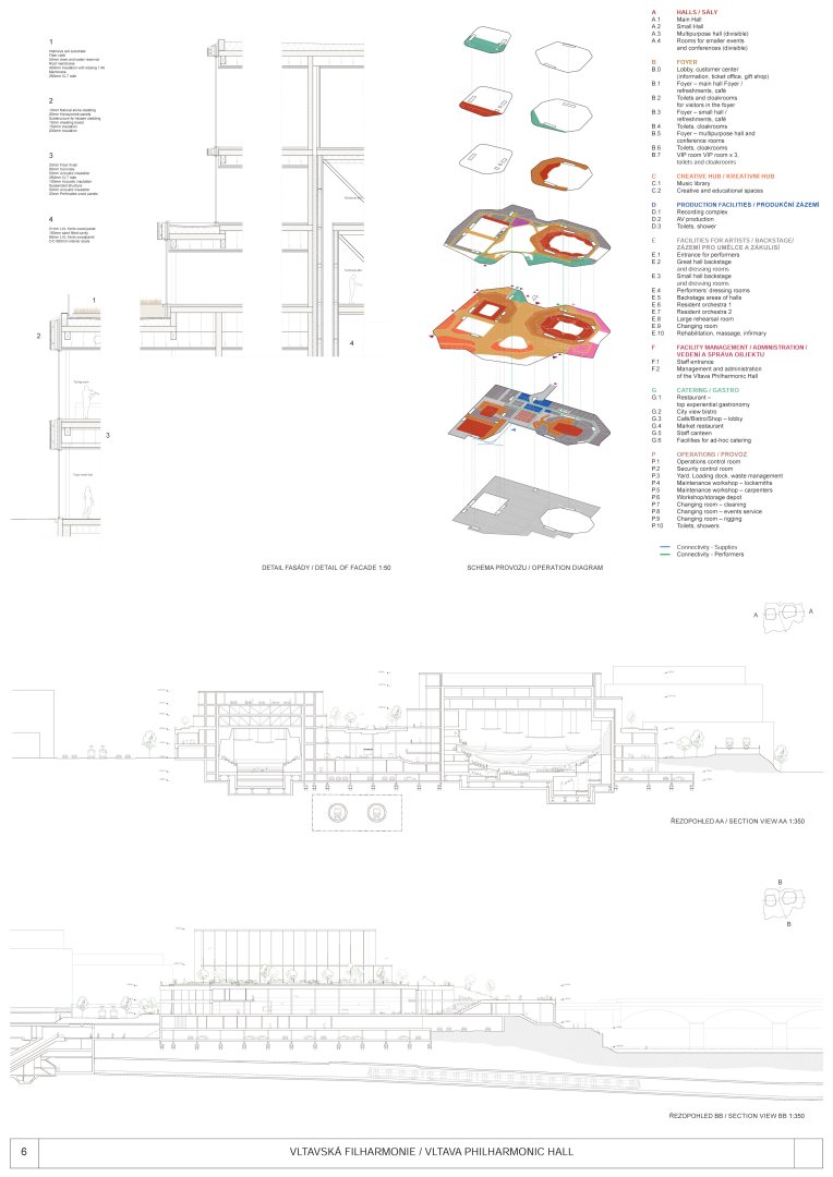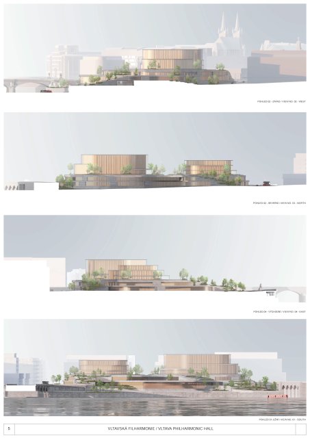 Filharmonie se nachází na rozhraní dvou os, začátku magistrály a modro-zelené struktury podél Vltavy. Navrhujeme hybridní typologii budov, která spojuje městské ulice se zřetelnými fasádami a zároveň ustupuje a nabízí okolí a návštěvníkům velkolepou krajinu a park s výhledem na Prahu.