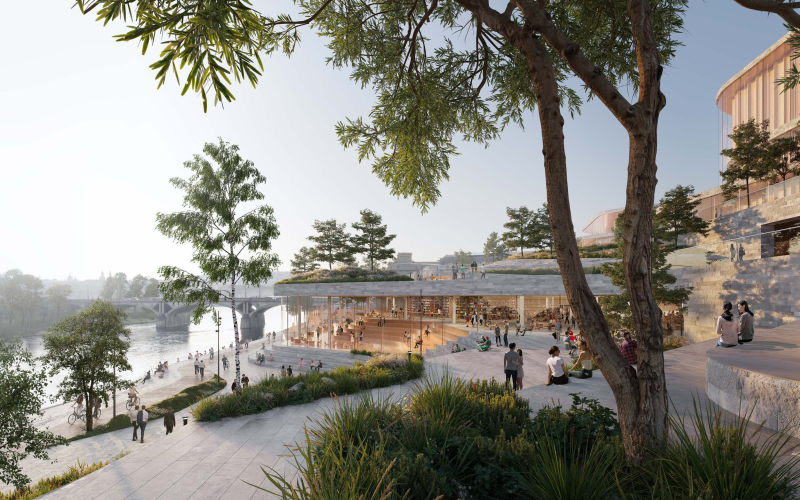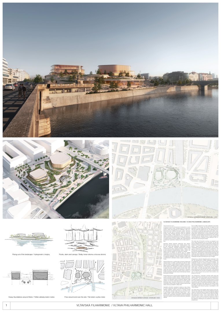 Od dopravní situace k urbanistickému katalyzátoru a centru hudebního života v Praze. Představujeme si, že vytvoříme kulturní místo nové generace pro setkávání, kde se filharmonický sál a městský život spojí v jedno. Výchozím bodem pro náš návrh je vytvoření kvalitního veřejného prostoru, který poskytuje přirozené místo pro setkávání milovníků hudby i široké veřejnosti. Tím, že stavíme na lidsky a urbanisticky zaměřeném přístupu, formujeme filharmonický sál a vytváříme budovu s vysokými ambicemi na veřejný prostor a kulturní zážitek, kde vzniká jedinečné prostředí pro nepřetržitý městský život a hudbu podél Vltavy.