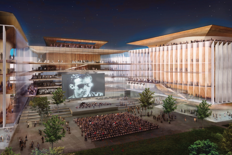 Stupňovité krajinářské řešení překlenuje stávající nábřeží Kapitána Jaroše a propojuje Vltavu i novou nábřežní promenádu s areálem filharmonie a okolní čtvrtí. Dvě formálnější náměstí v severovýchodním a severozápadním rohu pozemku propojují život uvnitř i vně budovy a nábřežní park. Veřejnost může procházet od zastávek MHD k nábřeží, aniž by musela vstupovat do budovy.