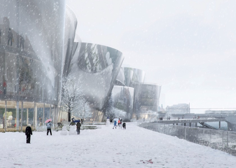 Náš návrh je veřejným prostorem v měřítku čtvrti, který se obrací zevnitř ven a vytváří novou porézní a živou krajinu. Jedná se o elegantní architekturu s atmosférou parku: shluky aktivit se rozvíjejí vedle sebe nebo společně jako jeden celek, vizuálně i zážitkově. Návrh stírá jakýkoli jasný rozdíl mezi interiérem a exteriérem díky volnému rozmístění zakřivených stěn, které jemně rámují každý prostor a nabízejí programy k rozšiřování, smršťování a rozlévání ven. Filharmonický sál je srdcem návrhu, který propojuje řeku, ulice a oblohu do živého celkového prostředí.